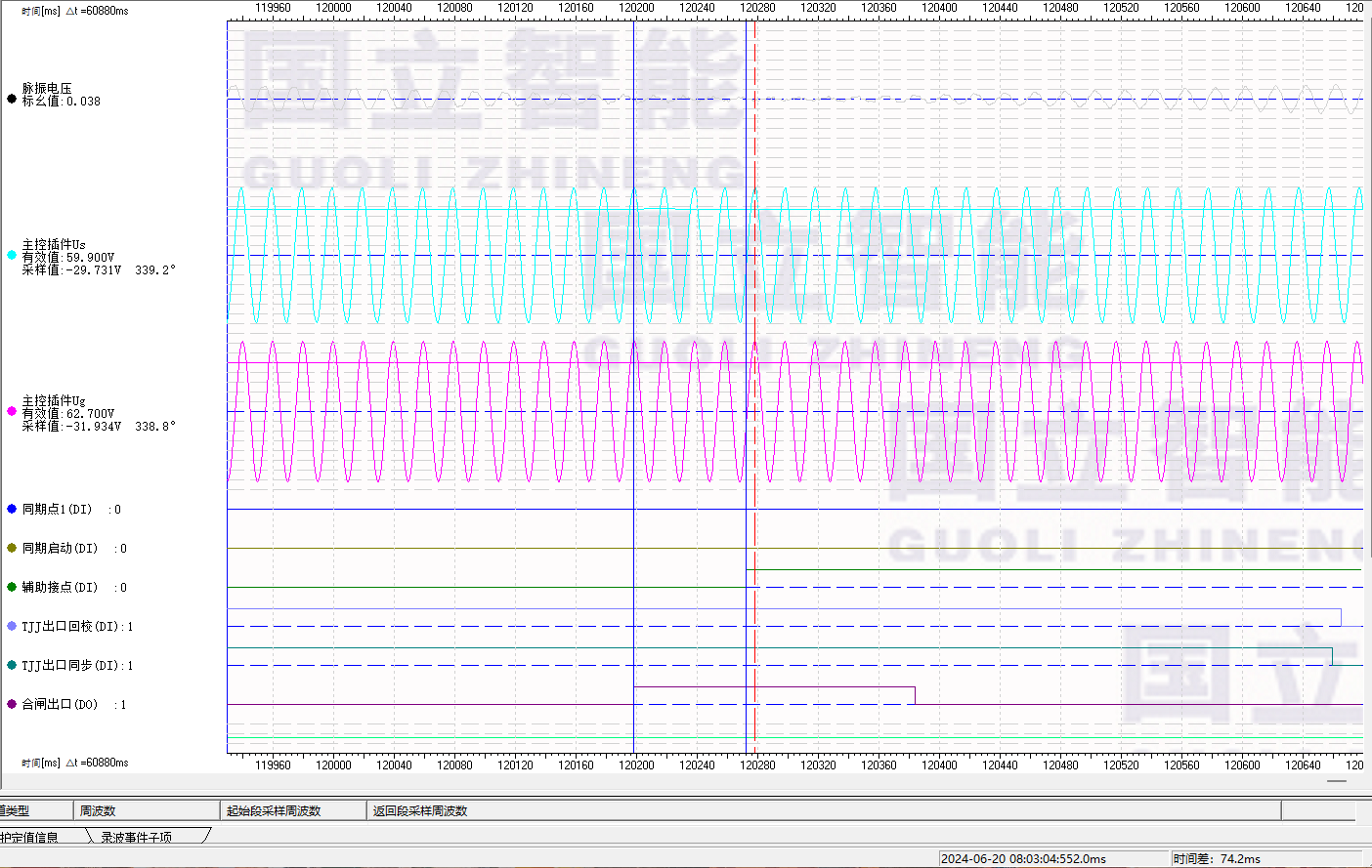 通过波形可知在并网开关合闸瞬间发电机与电网两侧相角差仅为0.4度,且此时发电机侧的电压量高于电网侧,这能够有效防止电网对发电机造成冲击。